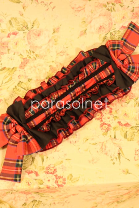 赤タータンチェックフリルにリボンをあしらった大ぶりのヘッドドレスです。