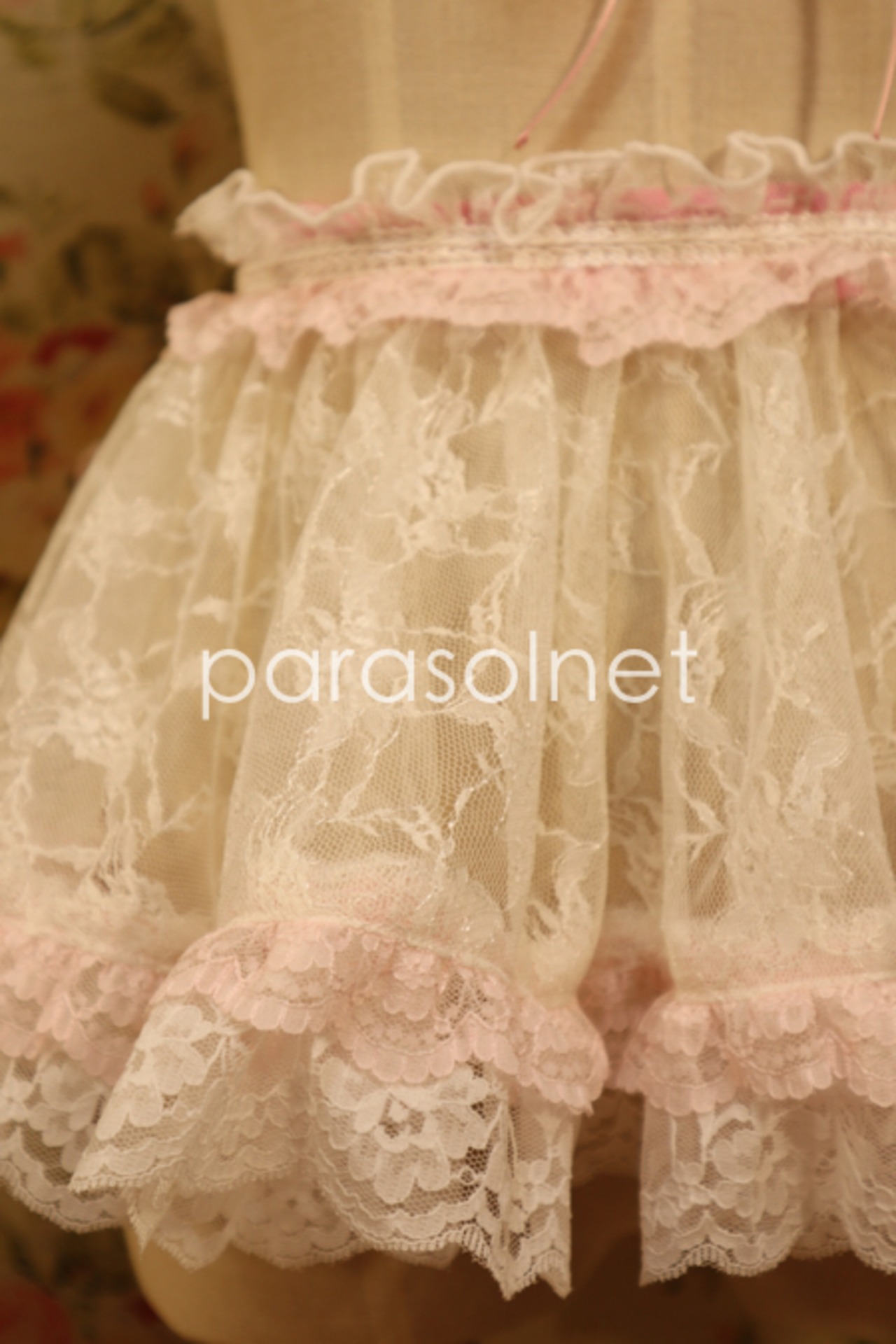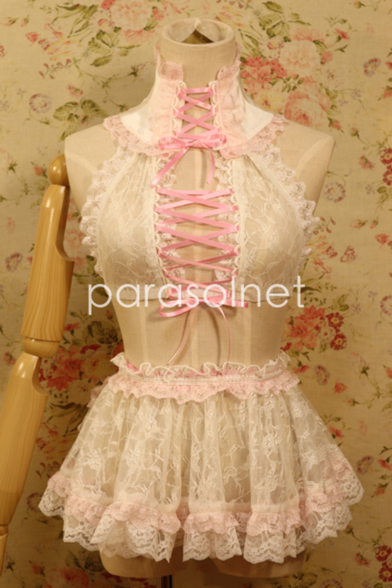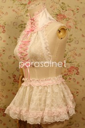 胸飾り付きネックコルセットとレースエプロンのセットアップ白