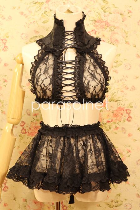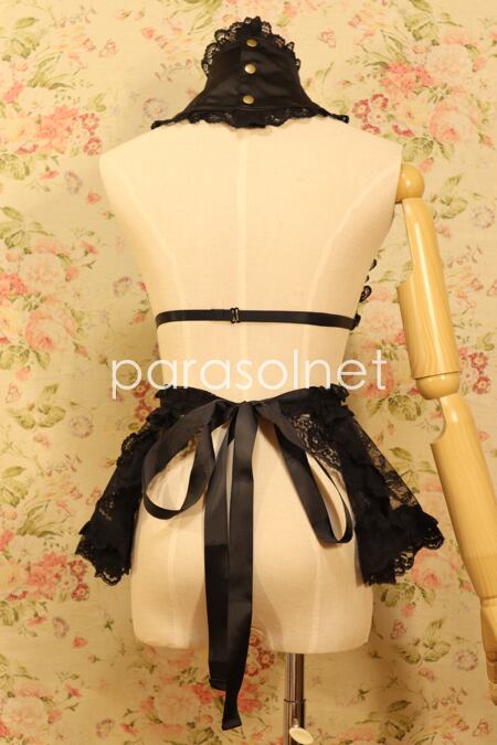 胸飾り付きネックコルセットとレースエプロンのセットアップ黒